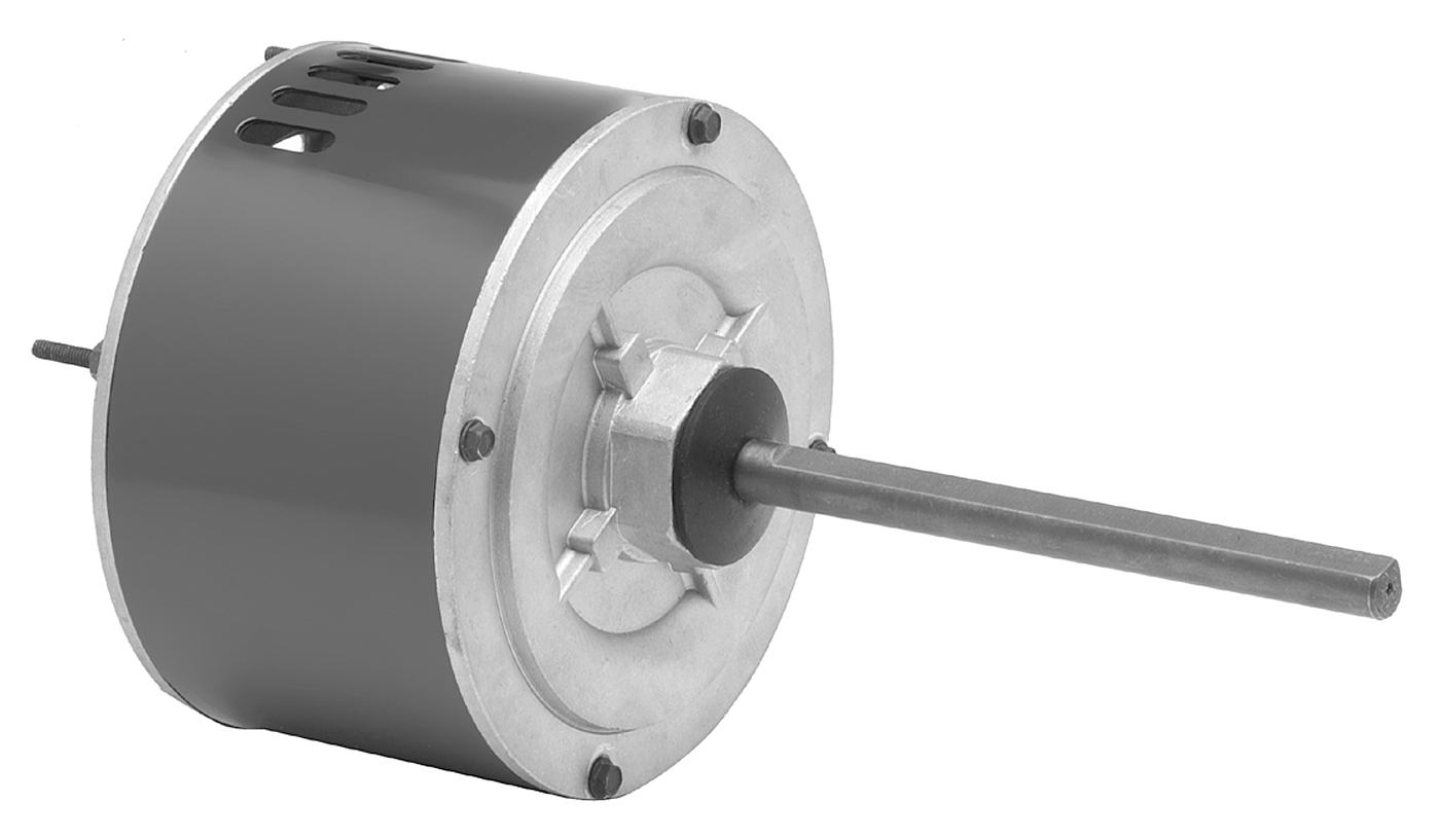 Condenser Fan Motor Permanent Split Capacitor (PSC), Capacitor required 27" Leads 1/2" Diameter Shaft with Double Flat Extended Studs Shaft End and Lead End, Belly Band